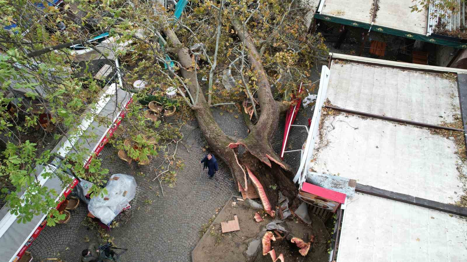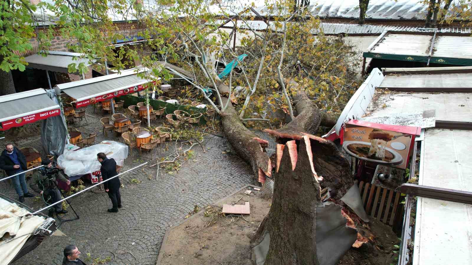 Kafelerin bulunduğu ve közde kahve ile meşhur olan İç Kozahan’daki devasa çınar saatteki hızı 100 kilometreye ulaşan fırtınaya dayanamadı. Gece yarısı büyük bir gürültüyle yıkılan dev çınar ağacı, sabah gelen esnaflar tarafından parçalara ayrılmış halde bulundu.