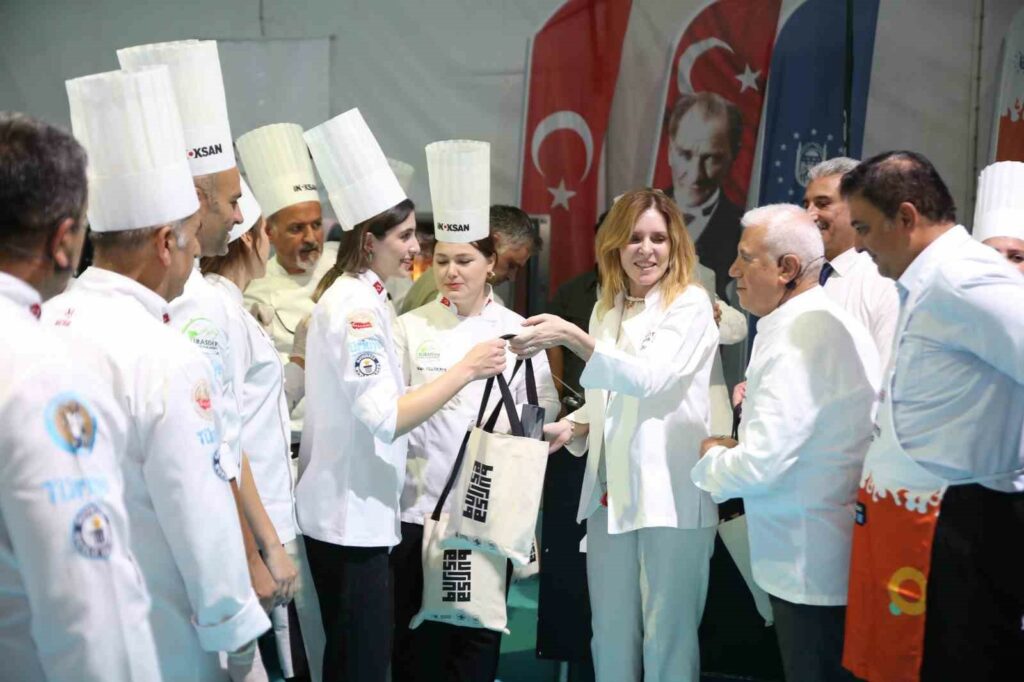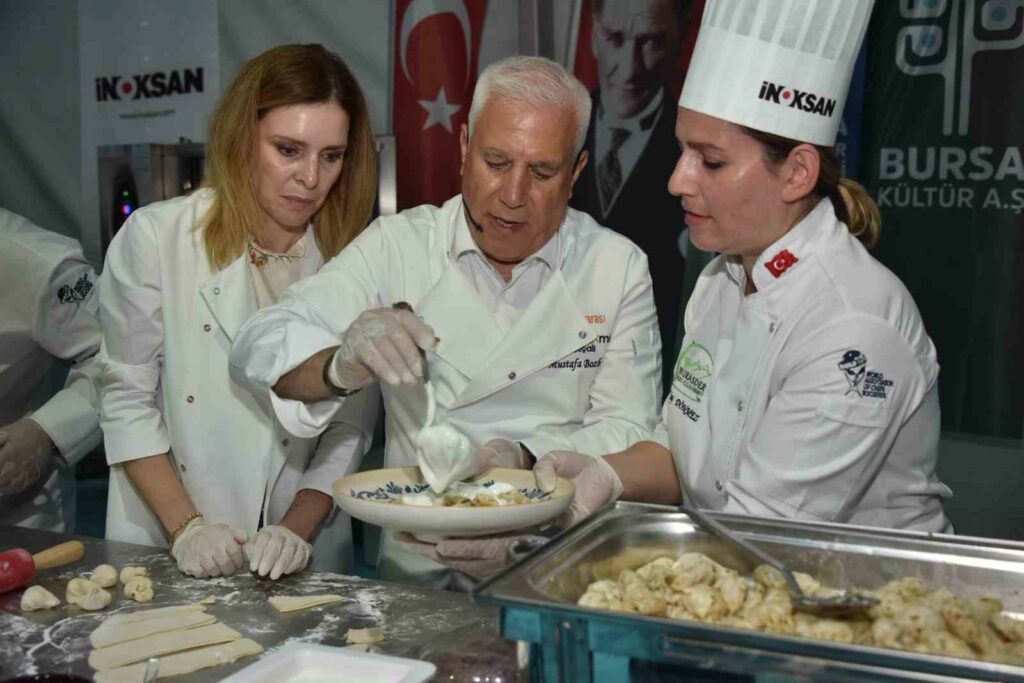Başkan Mustafa Bozbey, daha sonra yerel şef aşçıların eşliğinde Bursa yemeği yapmak üzere tezgahın başına geçti. Bursa Aşçılar Derneği’nin katkılarıyla düzenlenen programda, Başkan Bozbey, Vali Yardımcısı Rıza Gençoğlu, CHP İl Başkanı Nihat Yeşiltaş ve Büyükşehir Belediyesi bürokratları Bursa’nın coğrafi işaretli lezzetlerini yapmak için yeteneklerini sergiledi. Eşi Seden Bozbey ile birlikte mutfaktaki hünerlerini de gösteren Başkan Bozbey, izleyenlerden büyük alkış aldı. Yapılan yemekler, daha sonra misafirlere ikram edildi.