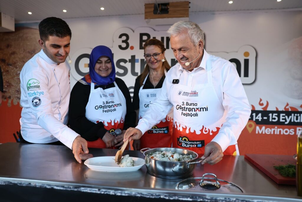 ‘Mobil Bursa Gastronomi Mutfağı’ndaki programda Ünlü Şef Dr. Esat Özata ve Barış Uysal Bursa mutfağı ve yerel lezzetler ile ilgili önemli bilgiler verdi. Nilüfer Belediye Başkanı Şadi Özdemir ile eşi Nuray Özdemir ise Bursa’nın coğrafi işaretli lezzetlerinden ‘enginarlı pilav’ yemeğini hazırladı. Yemeğin hazırlanması sırasında onlara enginarı ile ünlü Hasanağa Mahallesi’nin Kadın Dayanışma Yardımlaşma Derneği Başkanı Neşe Erken de eşlik etti. Başkan Şadi Özdemir ve eşi, Bursa mutfağının önemli yemeğini başarıyla sundu. Bursa mutfağının eşsiz lezzeti, katılımcılar tarafından büyük ilgi gördü. Enginarlı pilav, daha sonra vatandaşlara ikram edildi.