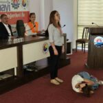 Deprem sırasında gösterilecek en doğru davranış şekli olan “Çök-Kapan-Tutun” pozisyonunu uygulamalı olarak dinleyicilere gösteren Selda Aydın bu pozisyonun ev dışında herhangi bir açık alanda, sinemada, hastanede, araçta nasıl gerçekleştirilebileceğini de ayrı ayrı dile getirdi.