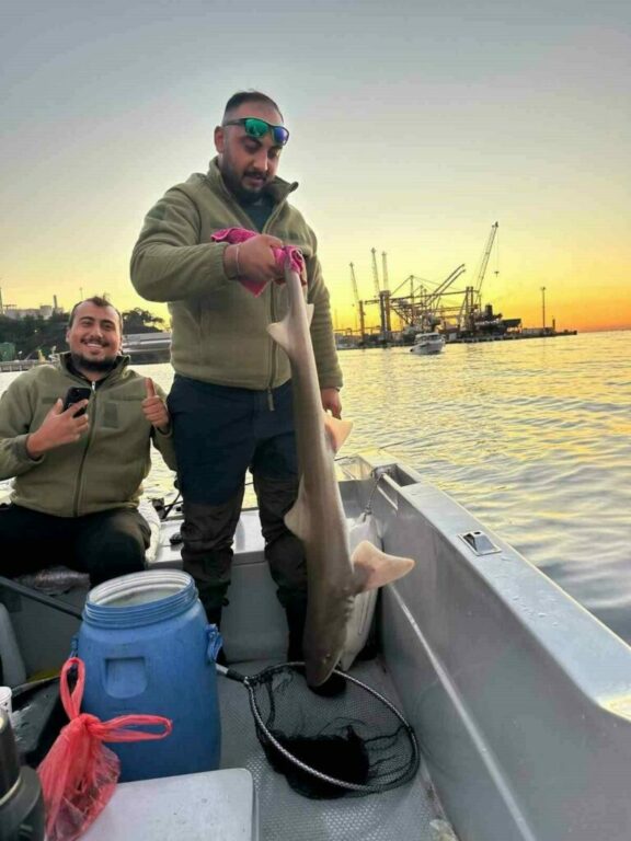 Gemlik Körfezi’nde denize açılan balıkçılar, oltalarına takılan canlının köpek balığı olduğunu fark etti. Kısa süreli şaşkınlık yaşayan balıkçılar, dikkatli bir şekilde köpek balığını tekneye almayı başardı.