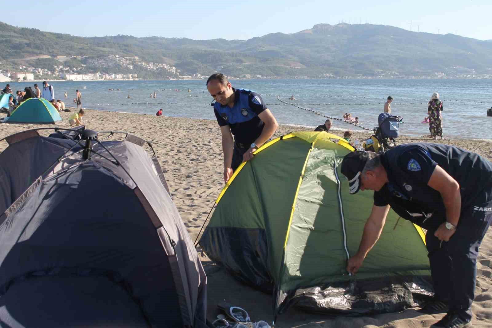 Bursa Büyükşehir Belediyesi Zabıta Daire Başkanlığı ekipleri, Gemlik Belediyesi Zabıta Müdürlüğü’nün de desteğiyle, ilçenin sahil şeridi bölgelerinden Kumsaz ve Gemsaz’da çadır operasyonu gerçekleştirdi. Ekiplere Gencali Muhtarı Mürüvet Günay ile Ata Mahallesi Muhtarı Tuncay Gümüş de eşlik etti.