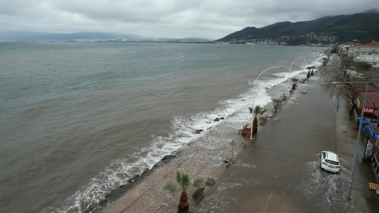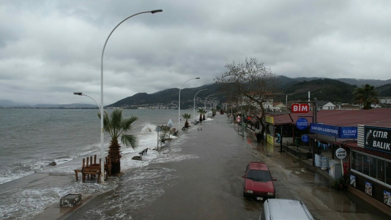 Fırtınanın etkisiyle oluşan deniz taşkını ve dalgaların yola kadar ulaştığı anlar ise dron ile havadan görüntülendi. Görüntülerde sahil yolunun büyük bölümünün suyla kaplandığı ve dalgaların kıyı hattını aştığı görüldü.