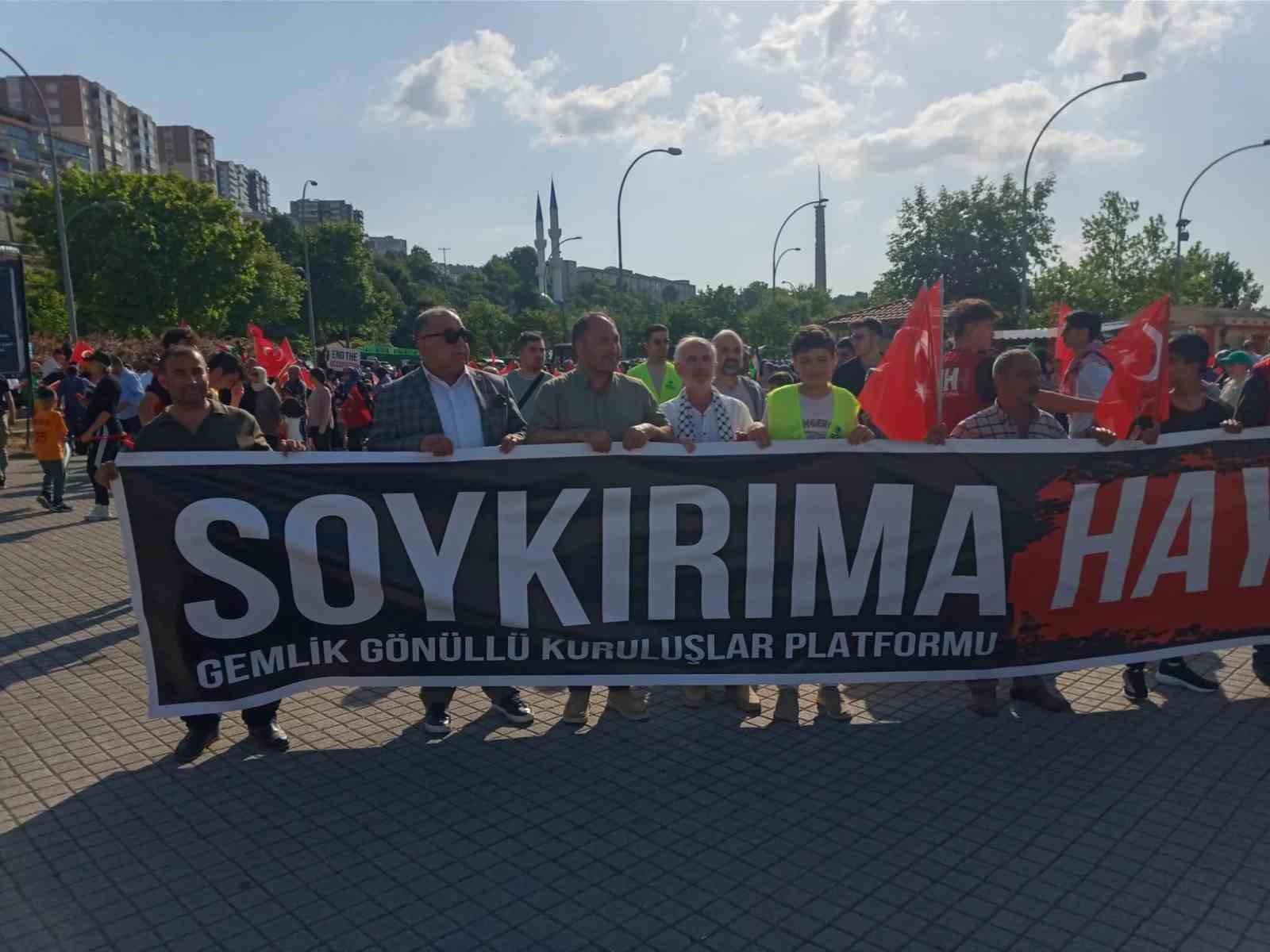Bursa’nın Gemlik ilçesinde İsrail’in Filistin’e yönelik soykırımı telin edildi. Gemliklilerin yoğun katılım gösterdiği yürüyüş sonrası miting düzenlendi.
