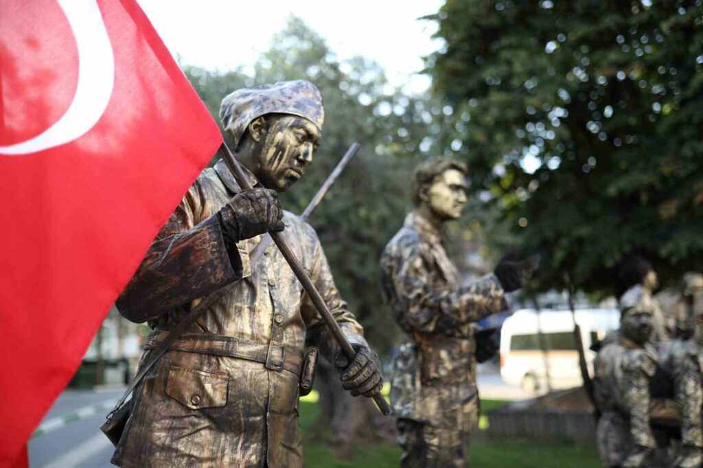 Kurtuluş Savaşı’nda mücadele etmiş sembol karakterlere hayat veren canlı heykeller, ilçe merkezi ve İskele Meydanı’nda sergilendi. Sanatçılar, saatlerce sabit durarak, zaman zaman pozlarını değiştirerek Milli Mücadele’yi Gemliklilere anlattılar.