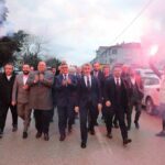 Salona meşaleler ve sloganlar eşliğinde kortej halinde yürüyerek gelen Yeniden Refah Partisi Gemlik Belediye Başkan Adayı Gencay Yılmaz, salon girişinde alkışlarla karşılandı.