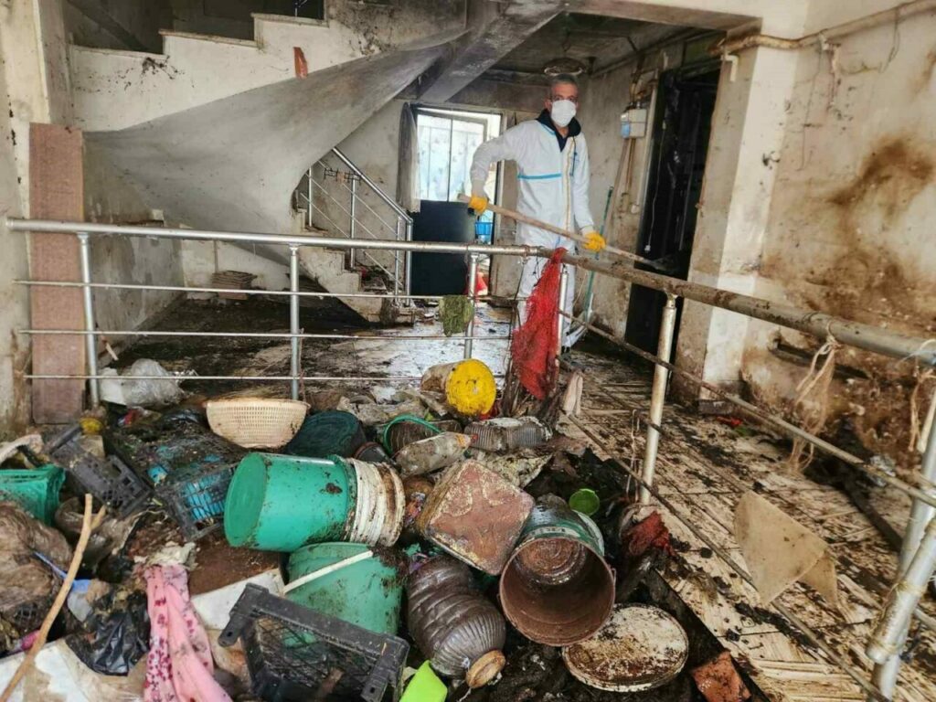 Evin tamamen boşaltılmasının ardından, biriken çöplerin neden olduğu bakteri, haşere ve kötü koku oluşumunu engellemek amacıyla binanın içi ve çevresi detaylı bir şekilde ilaçlanarak dezenfekte edildi.