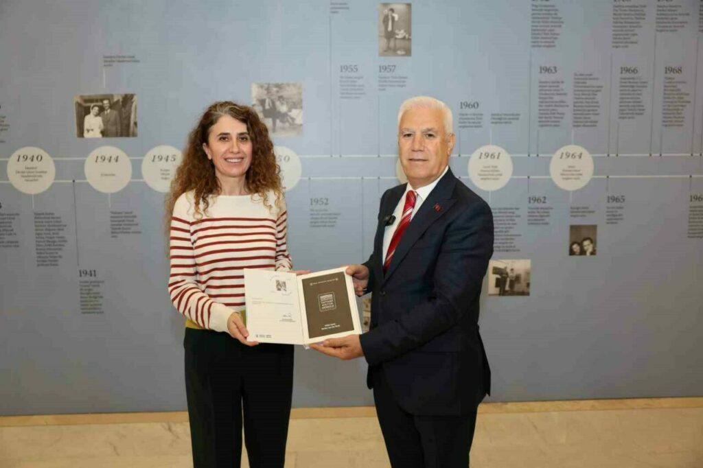 Ziyaretin sonunda Başkan Mustafa Bozbey, sergiye katkılarından dolayı Küratör Yasemin Bay’a hediye verdi.