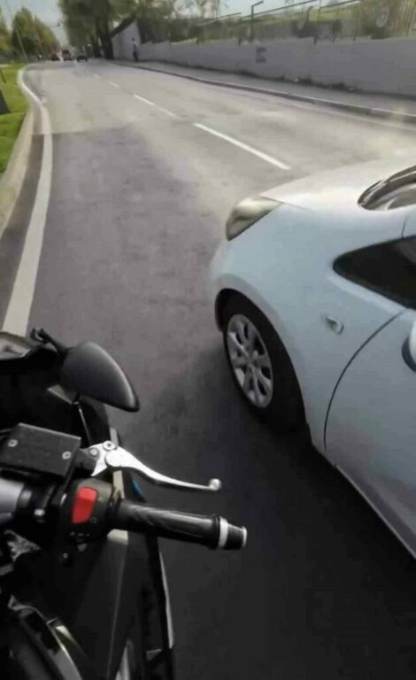 Bursa’da seyir halindeki bir motosikletli, kırmızı ışıkta geçerek önüne aniden manevra yapan otomobile tepki gösterdi. Sinirlerine hâkim olamayan motosikletli, aracın yanına yaklaşarak dikiz aynasını kırdı. O anlar kameraya anbean yansıdı.