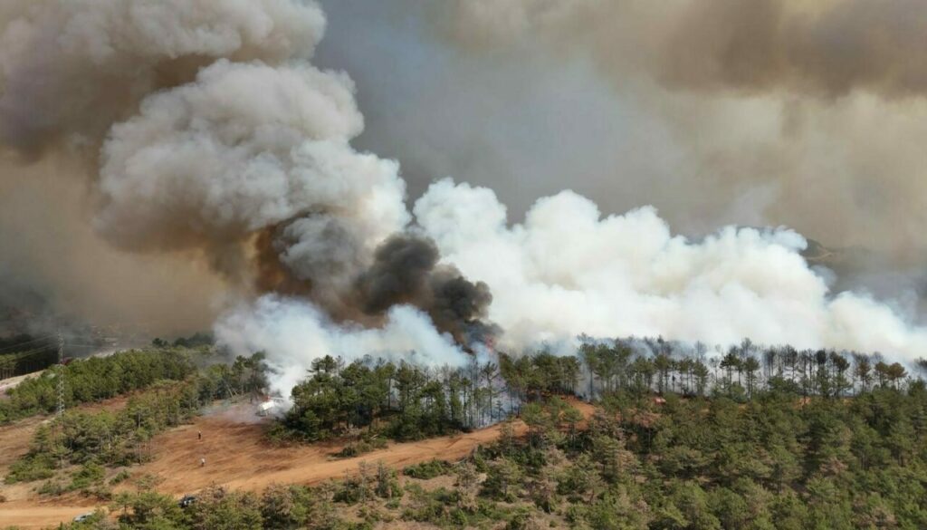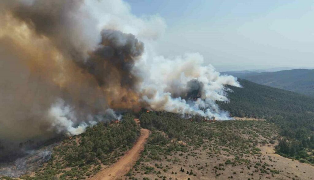 Dron ile çekilen görüntüler, yangının ulaştığı boyutları gözler önüne sererken, alevlerin ormanlık alanı hızla sardığı görülüyor. Ekipler, yangını kontrol altına almak için yoğunçabaharcıyor.