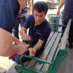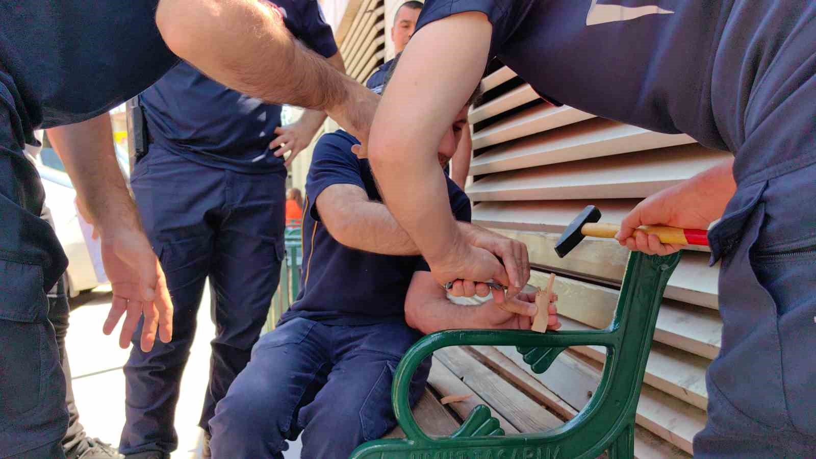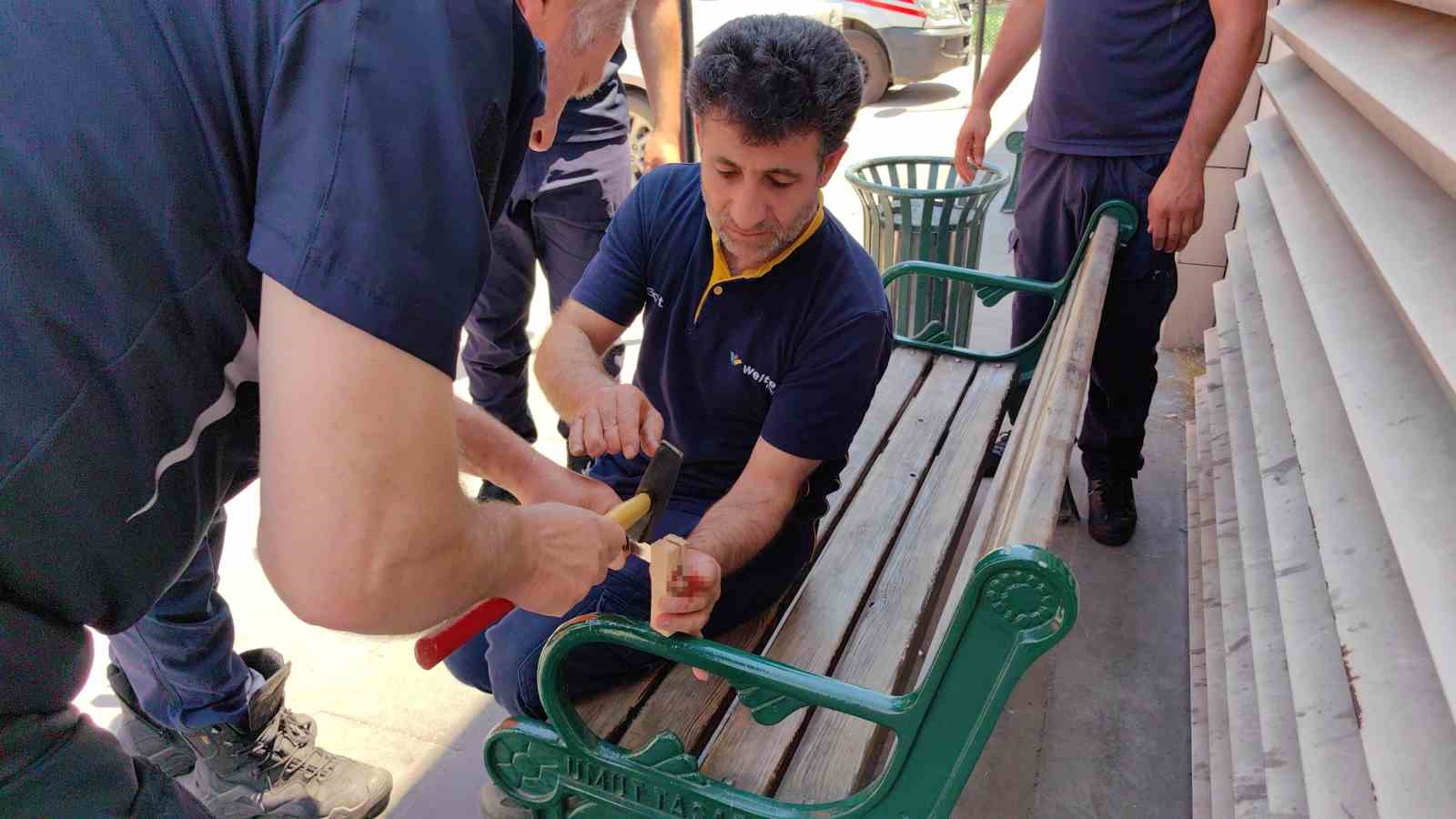 Hastaneye İtfaiye Arama Kurtarma ekipleri sevk edildi. Ekipler İnegöl Devlet Hastanesi’nin Acil servis girişindeki bank üzerinde işçinin elindeki ahşabı parçalayarak çıkardı.