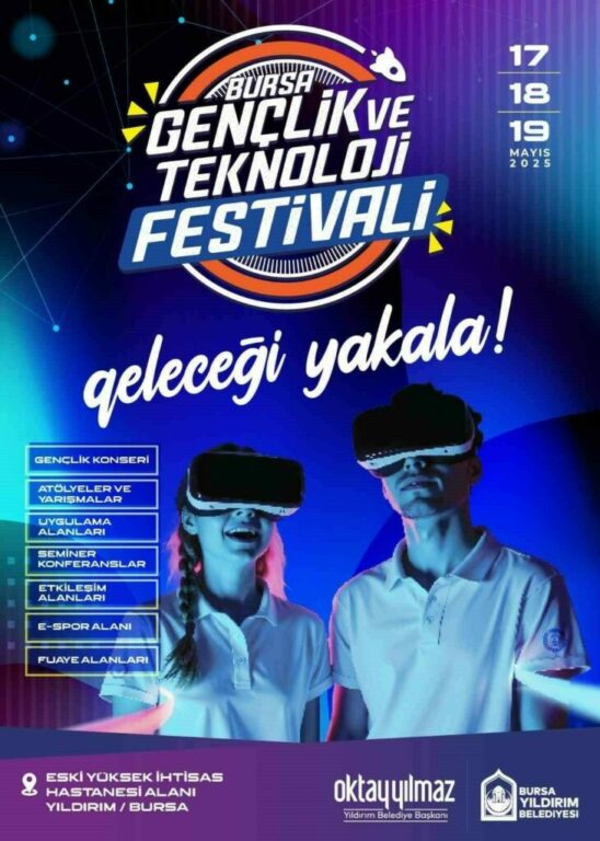 Yıldırım Belediyesi, 17-19 Mayıs tarihlerinde ‘Bursa Gençlik ve Teknoloji Festivali düzenliyor. Eski İhtisas Hastanesi Alanı’nda yapılacak festivalde; teknoloji ve robot atölyelerinden konserlere, söyleşilerden yarışmalara çok sayıda etkinlik gerçekleştirilecek. ShiftDelete.Net’in kurucusu Hakkı Alkan, Astronot Tuva Cihangir Atasever, Akademisyen, Yazar ve İletişim Uzmanı Prof. Dr. Uğur Batı ve Youtuber Sertaç Güngör’ün konuşmacı olacak katılacağı etkinlikte ayrıca Rumelili Ekrem ve Retrobüs konserleri düzenlenecek. Sinolab deney oyunları, bilim partisi, atölye çalışmalarının da yer aldığı festival kapsamında Yapay Zekâ Şarkı yarışması düzenlenecek.