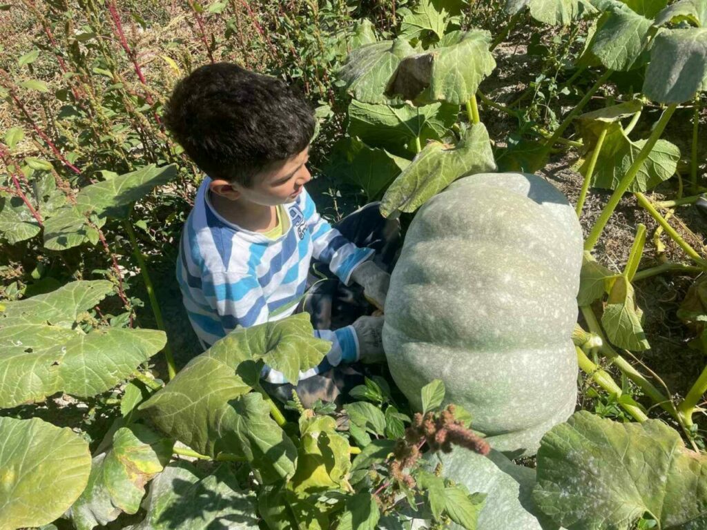 Bahçesindeki kabakları hasat ederken ikisinin 40 kilograma ulaştığını gören çiftçi, mutluluktan iri kabaklarıyla konuştu, onları elleriye okşayarak sevdi.