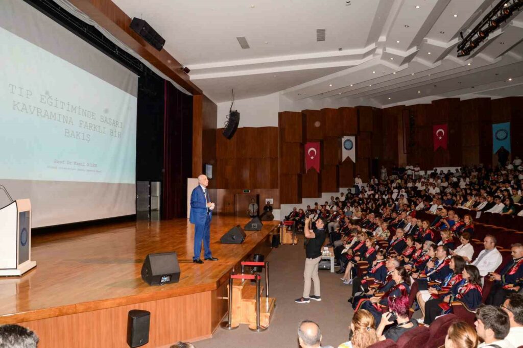 Açılış konuşmalarının ardından Tıp Fakültesi 2024-2025 Eğitim-Öğretim Yılı ilk dersini önceki dönem rektörlerinden Prof. Dr. Kamil Dilek verdi. “Tıp Eğitiminde Başarı Kavramına Farklı Bir Bakış” konulu bir sunum yapan Prof. Dr. Kamil Dilek, tüm akademisyen ve öğrencilere başarılar diledi. Etkinlik, Tıp Fakültesi Dekan Yardımcısı Prof. Dr. Züleyha Alper’in öncülüğünde hekimlik andının okunması ve yeni öğrencilere beyaz önlüklerinin giydirilmesinin ardından sona erdi.