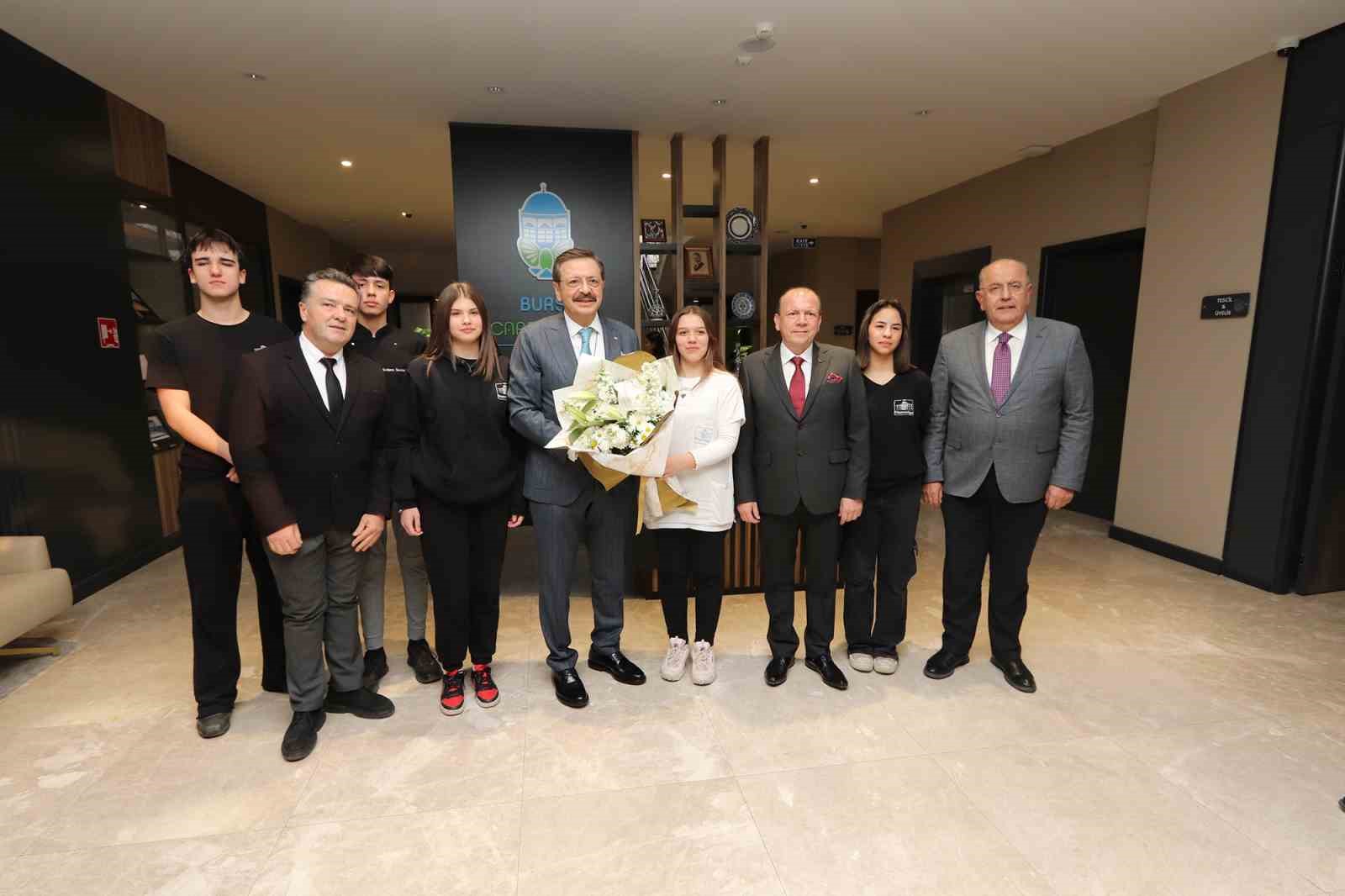 Hamidiye Mesleki ve Teknik Anadolu Lisesi Müdürü Ali Cihan ise, TOBB Başkanı M. Rifat Hisarcıklıoğlu ve TOBB Yönetim Kurulu Üyelerine okulda hayata geçirilen faaliyetlere ilişkin sunum yaptı. Bursa Ticaret Borsası’nın himayelerinde yürütülen çalışmalar ile Hamidiye Mesleki ve Teknik Anadolu Lisesi’nin bugün sektörle iş birliği yapan ve ihtiyaç duyulan alanlarda sektöre istihdam sağlayan bir okul haline geldiğini belirten Ali Cihan, “Milli Eğitim Bakanlığımız ve TOBB başta olmak üzere desteklerini hiçbir zaman bizden esirgemeyen Bursa Ticaret Borsası Başkanımız Özer Matlı’ya öğrencilerim adına şükranlarımı sunuyorum” ifadelerini kullandı.