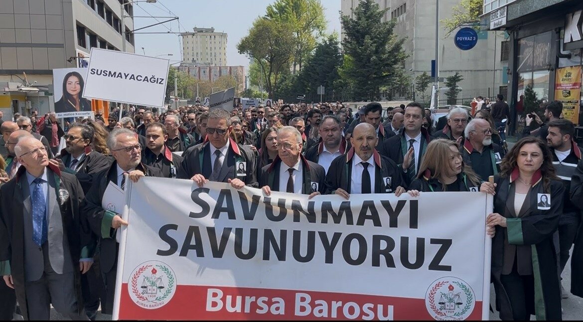 Olayın ardından Türkiye Barolar Birliği Başkanı Erinç Sağkan, Metin Öztosun ve İbrahim Kaboğlu başta olmak üzere çok sayıda baro başkanı ve avukat Bursa’da bir araya geldi. Adliye önünde toplanan kalabalık, sloganlar eşliğinde yürüyüş gerçekleştirirken yapılan ortak açıklamada şu ifadelere yer verildi: