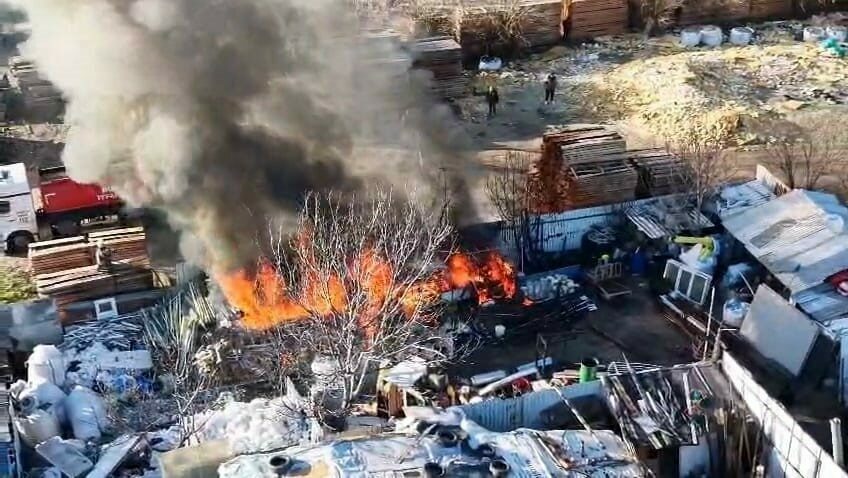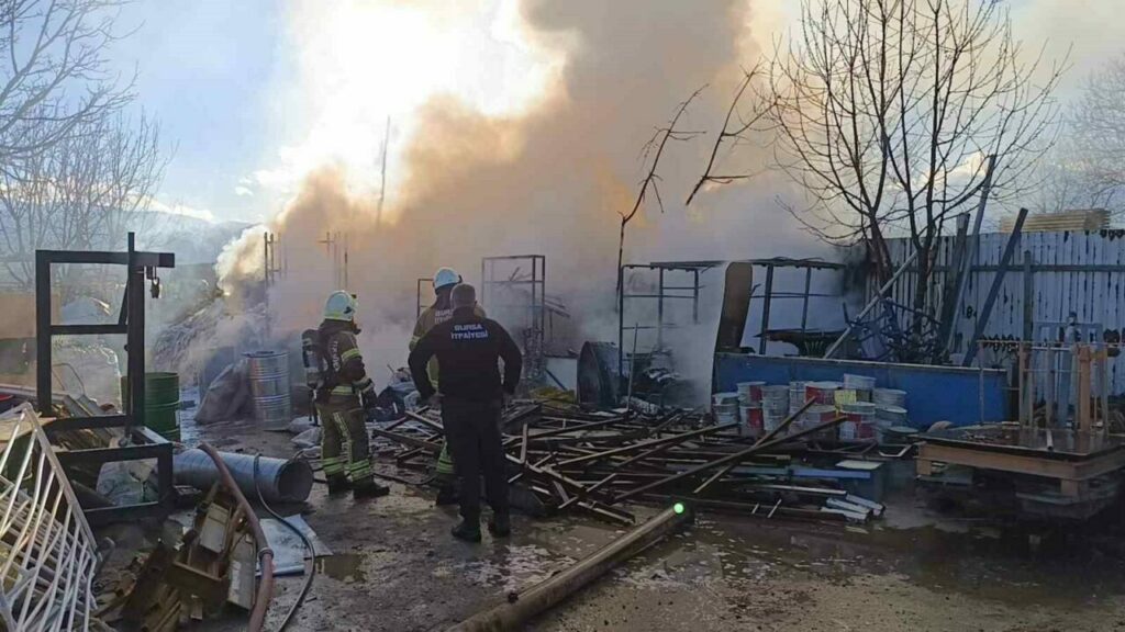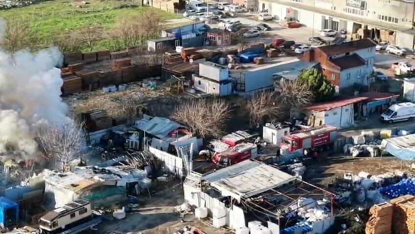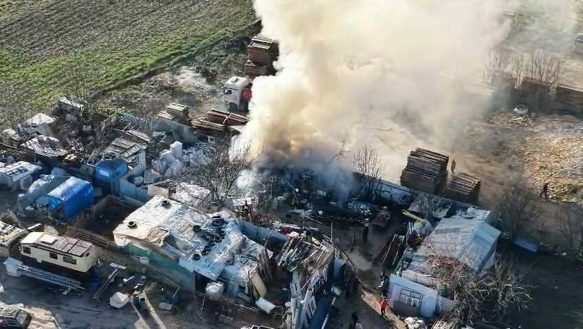 Bursa’nın İnegöl ilçesinde faaliyet gösteren bir geri dönüşüm (hurdacı) tesisinde yangın çıktı. Yangın havadan görüntülendi.