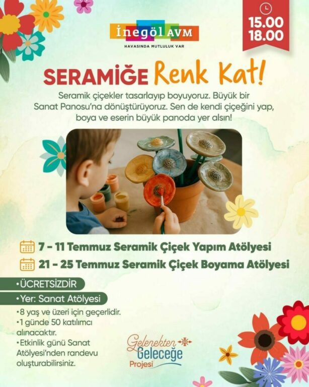 Temmuz ayı boyunca sanatla buluşma devam ediyor. 12-13 Temmuz tarihlerinde düzenlenecek olan Çömlek Atölyesi, 6 yaş ve üzeri katılımcılara çamurla tanışma ve kendi çömleklerini yapma fırsatı sunacak. Ardından 21-25 Temmuz tarihleri arasında gerçekleştirilecek Seramik Çiçek Boyama Atölyesi ile tasarımına renk katmak isteyen tüm ziyaretçiler atölyeye davet edilecek. Etkinlikler sırasıyla 16.00-19.00 ve 15.00-18.00 saatleri arasında, Sanat Atölyesi alanında gerçekleştirilecek.