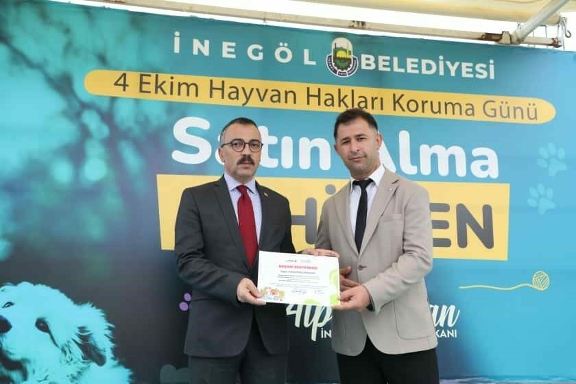 Bugün ilçe protokolü ve öğrencilerin ağırlıklı olarak katıldığı programla kutlanan 4 Ekim Hayvanları Koruma Günü kapsamında, aynı zamanda ilçedeki okullarda sokak hayvanlarıyla ilgili yapılan çeşitli yarışmalarda dereceye giren okul ve öğrencilere belge ve hediye takdimleri yapıldı. Aynı zamanda İnegöl Belediyesi ile Kent Konseyi iş birliğinde, Kent Konseyi Başkanı Bülent Temelli ile Sokak Hayvanları Çalışma Grubu Başkanı Şebnem Erkal tarafından başlatılan “Kalbine Misafir Olmaya Geldim” kampanyasıyla kurumların sahiplenme sürecine dahil olması hedeflendi. Bu kapsamda Kaymakam Eren Arslan ve Belediye Başkanı Alper Taban da kurumları adına kedi ve köpek sahiplendiler.