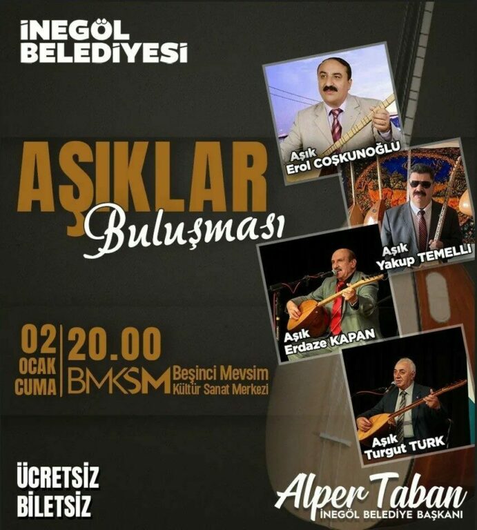 İnegöl Belediyesi, Anadolu’nun köklü kültür miraslarından biri olan aşıklık geleneğini yaşatmak ve gelecek nesillere aktarmak amacıyla “Aşıklar Buluşması” programını vatandaşlarla buluşturuyor. Halk ozanlarının sazları ve sözleriyle sahne alacağı programda; Aşık Erol Coşkunoğlu, Aşık Yakup Temelli, Aşık Erdaze Kapan ve Aşık Turgut Türk İnegöllülerle bir araya gelecek. Türk halk edebiyatının önemli temsilcilerinin katılımıyla gerçekleşecek etkinlik, kültür ve sanat dolu bir akşam sunacak.