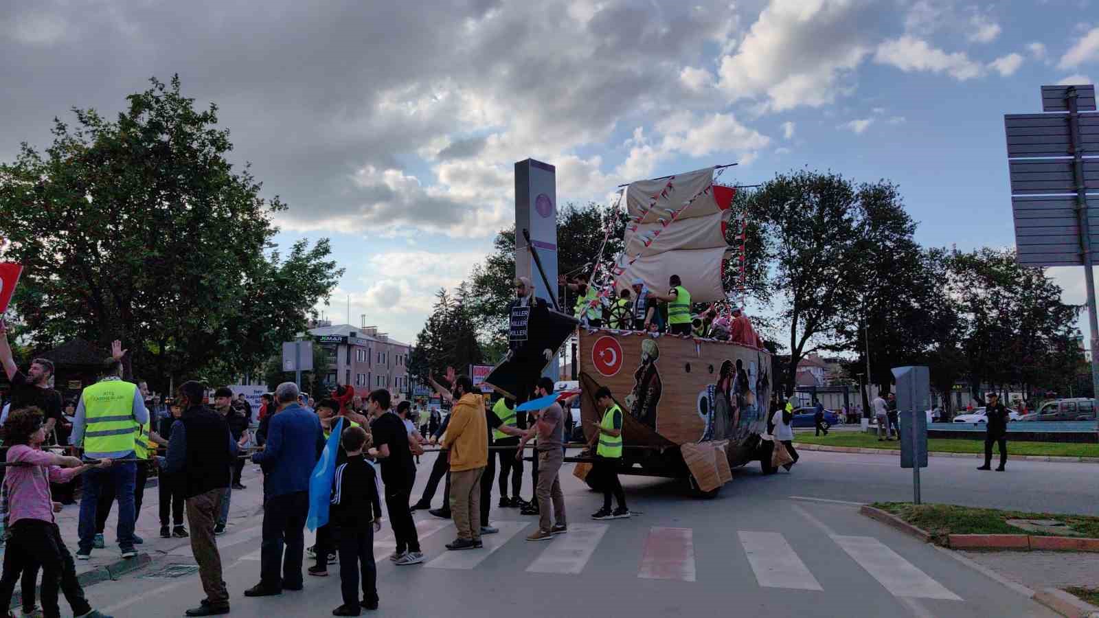 İnegöl’de sivil toplum kuruluşları öncülüğünde Gazze için düzenlenen eylemde yüzlerce vatandaş ellerinde bayraklarla yürüdü. Geminin de karadan yürütüldüğü destek yürüşünde İsrail’e tepki yağdı.
