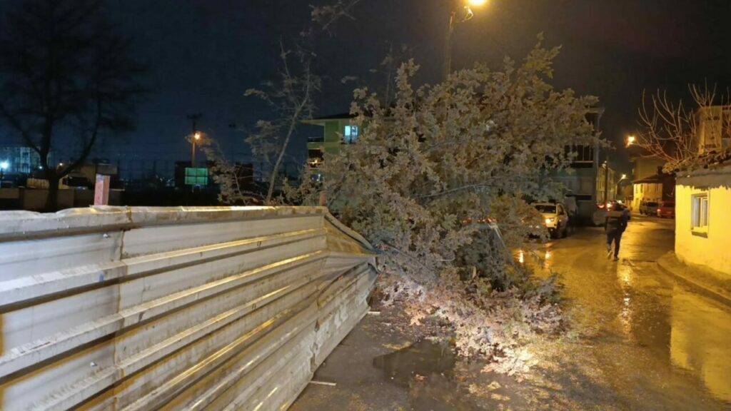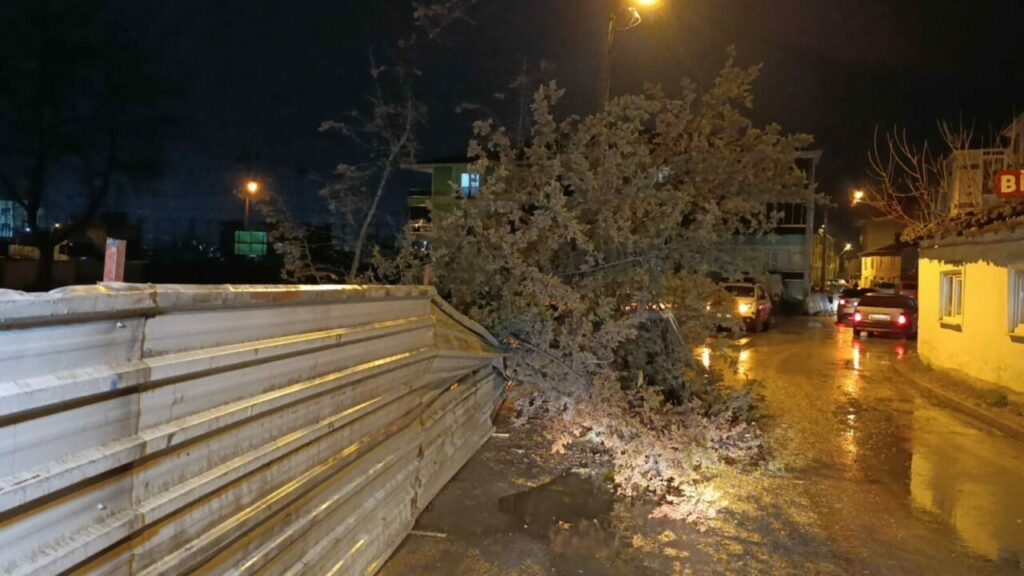 Bursa’nın İnegöl ilçesinde bir inşaat alanında bulunan ağaç, yağış ve rüzgarın etkisiyle kökünden çıkarak yola devrildi. Olay sırasında yoldan geçen kimsenin olmaması muhtemel bir facianın önüne geçti.