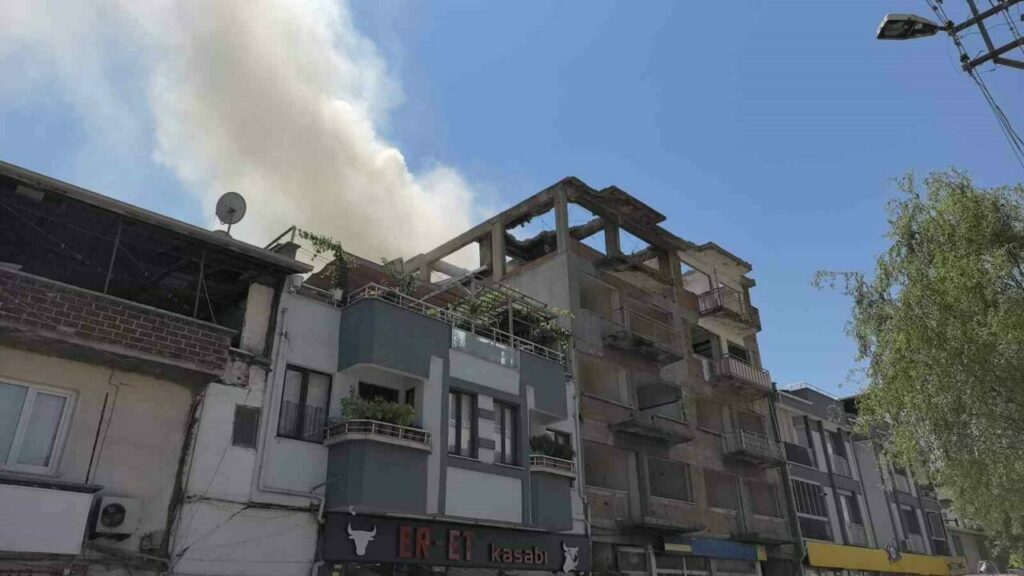 İnegöl’de yıkımına başlanan apartmanda yangın çıktı
