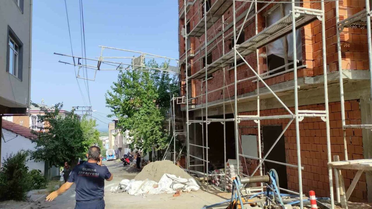 Bursa’nın Orhangazi ilçesinde bir inşaatın dördüncü katında sıva işi yapan işçinin üzerinde olduğu iskele, bina yanından geçen yüksek gerilim hattı tellerinin üzerine devrildi. İşçi son anda kendisini inşaatın 3. katına atarak kurtuldu.