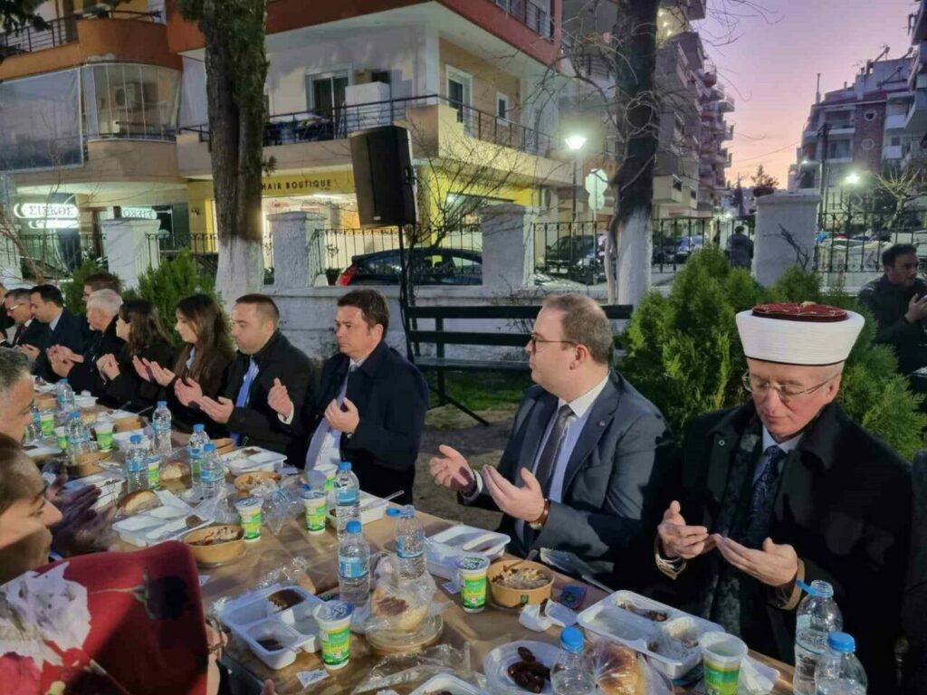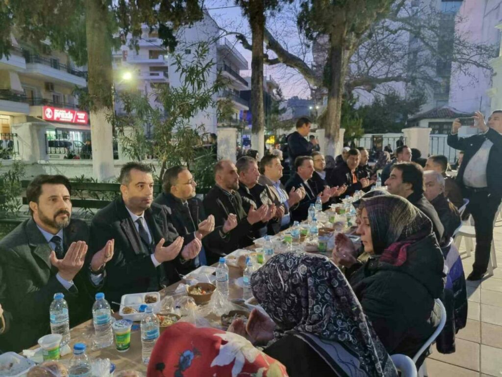 Ramazan ayının manevi iklimine uygun, birlik ve kardeşlik ruhunun en güzel şekilde yaşatıldığı İskeçe’deki iftar programında yüzlerce kişi aynı sofrada buluştu. Yunanistan’ın Türk ve Müslüman nüfusunun yoğunlukta olduğu İskeçe’de düzenlenen programlarda birlik ve beraberlik mesajları verilirken duygulu anlar da yaşandı. İftar yemeğine Osmangazi Belediye Başkanı Erkan Aydın’ın yanı sıra Gümülcine Başkonsolosu Aykut Ünal, Kozlukebir Belediye Başkanı Erdem Hüseyin, Gümülcine Türk Gençler Birliği Başkanı Sedat Hasan, İskece Müftüsü Mustafa Trampa, Osmangazi Belediye Başkan Yardımcıları ve Meclis Üyeleri ile Gümülcine, Dedeağaç ve İskeçe’den gelen soydaşlar katıldı. Cami avlusunda gerçekleştirilen iftar yemeğinde, akşam ezanının okunmasının ardından hep birlikte dua edilerek oruç açıldı.