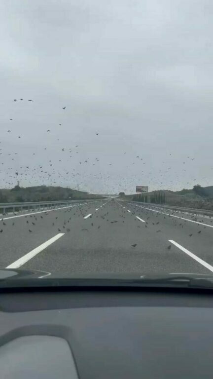 Yüzlerce sığırcık soğuk hava sebebiyle Bursa-İzmir otobanı üzerine kondu. Sığırcıklara çarpmamak için neredeyse durma noktasına gelen sürücüler o anları cep telefonlarıyla görüntülediler.
