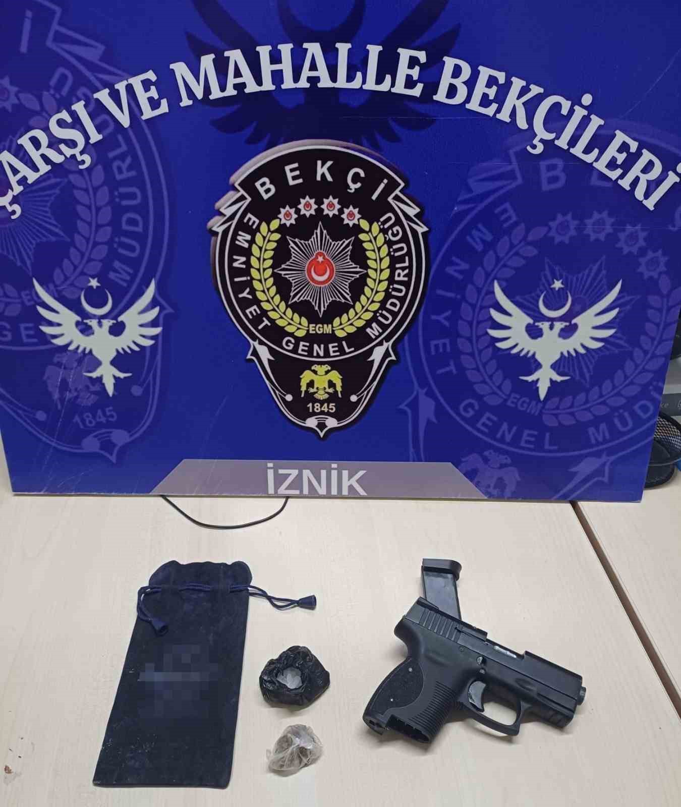 Öte yandan, İznik İlçe Müdürlüğüne bağlı bekçiler tarafından gece saatlerinde metruk yerler ve ara sokaklarda yapılan çalışmalarda 3 ayrı kişiden ruhsatsız silah ve uyuşturucu madde ele geçirildi.