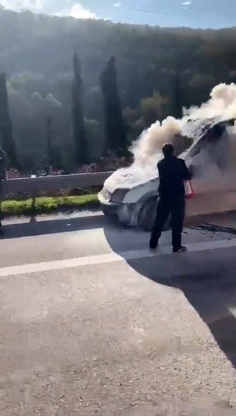 Olay, merkez Osmangazi ilçesi mevkiinde Gebze-Orhangazi-İzmir Otoyolunda meydana geldi. Edinilen bilgiye göre, İstanbul istikametine ilerleyen kamyonetten biranda dumanlar yükselmeye başladı. Sürücü, yolun kenarına çektiği kamyonetinin önünden çıkan dumanlara müdahale etmek istedi. 112 İtfaiye ekiplerini arayarak durumu bildirdi. Elindeki yangın tüpü ile çıkan alevleri söndürmeye çalışan sürücü ve yanındaki kişi, ne yapacağını şaşırdı. Alevler yapılan müdahalelere rağmen kamyonetin tamamını sardı.
