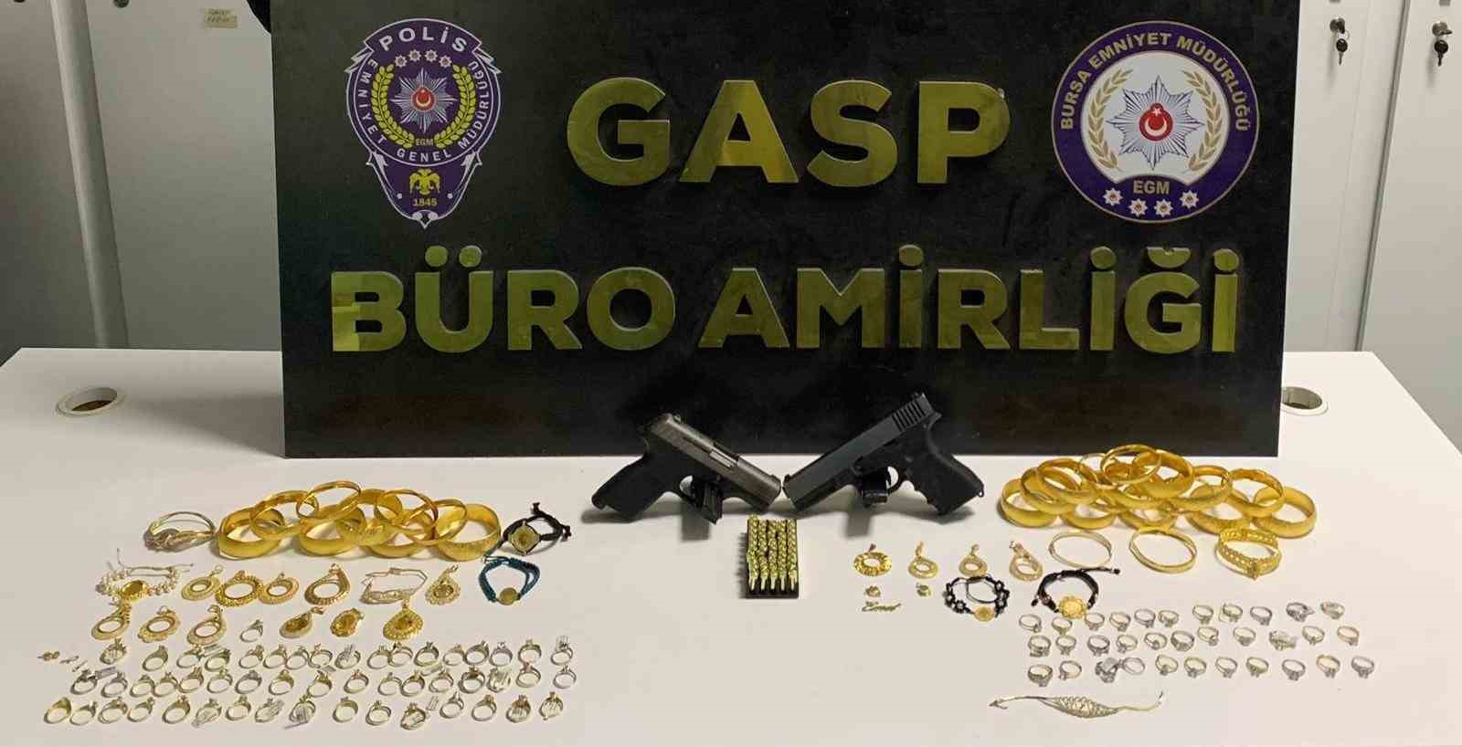 Ekipler, şüpheli E.Ç. (18) ve Ö.A. (20)’nın merkez Yıldırım ilçesi Yavuzselim Mahallesi’nde bir evde saklandıklarını tespit etti. Akşam saatlerinde operasyon için düğmeye basan ekipler, şüphelileri, altınları ve olay anında kullandıkları silahları kıskıvrak yakaladı.