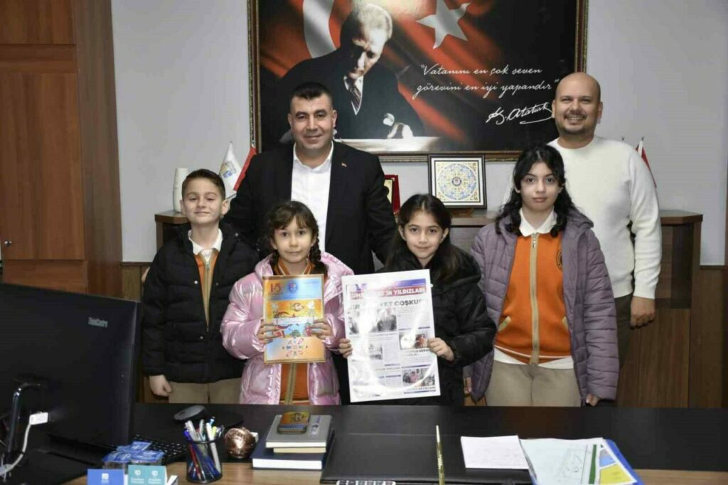 Karacabey Ticaret Borsası Cumhuriyet İlkokulu’nda öğrenim gören 3. ve 4. sınıf öğrencileri, eğitim hayatlarına değer katan örnek bir çalışmaya imza attı. Öğrenciler, öğretmenlerinin rehberliğinde hazırladıkları dergi ve okul gazetesinin tanıtımı kapsamında Karacabey Belediyesi’ni ziyaret ederek Belediye Başkan Yardımcıları İlyas Aksoy ve Bora Akın ile bir araya geldi.