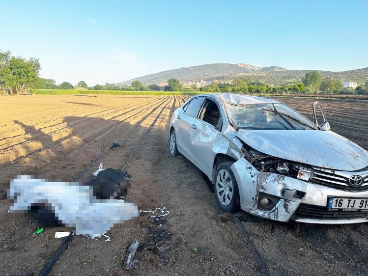 Bursa’nın Karacabey ilçesinde direksiyon hakimiyetini kaybeden otomobil sürücüsü kaza yaptı. Taklalar atarak tarlaya uçan araçtaki 1 kişi öldü, 2 kişi de yaralandı.