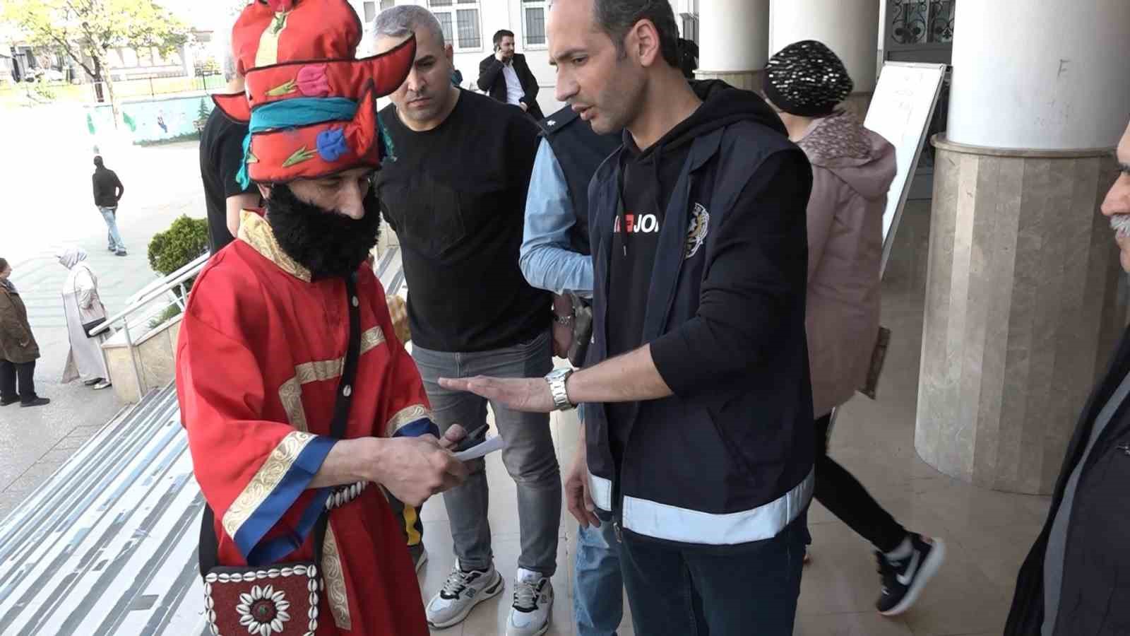 Kılıktan kılığa giren, yaptığı canlandırmalarla insanların dikkatini çekmeyi başaran Bursalı tiyatrocu Bahtiyar Keskin, bu seçim ise ‘Karagöz’ kostümüyle saf ve akıllı olmanın önemine dikkat çekmeye çalıştığını söyledi. Ancak, saflığa dikkat çekmek için giydiği ’Karagöz’ kostümünün cebine kimliğini koymayınca uzun süre kimliğinin gelmesini bekledi. Kimliğine kavuştuktan sonra ise kostümle içeri alınmak istenmeyen Keskin, sonunda oyunu kullandı.
