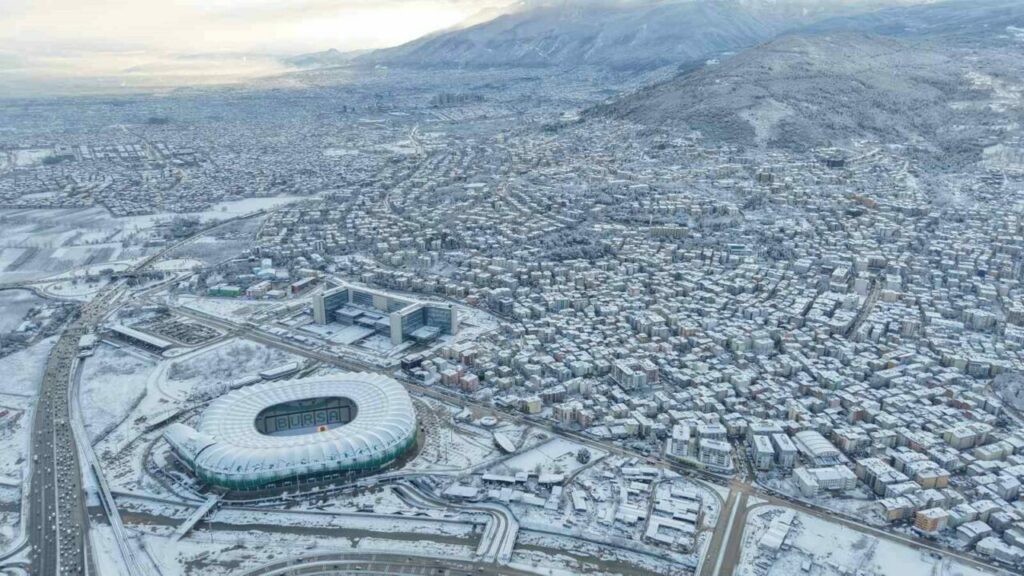 Bursa’da simge haline gelen mekanlar beyaza bürünürken, Timsah Arena Stadyumu’nun karla kaplı hali dron ile havadan görüntülendi.