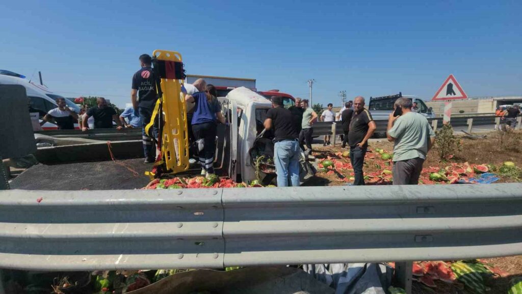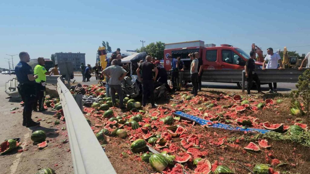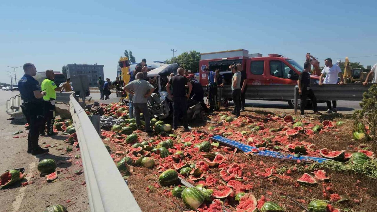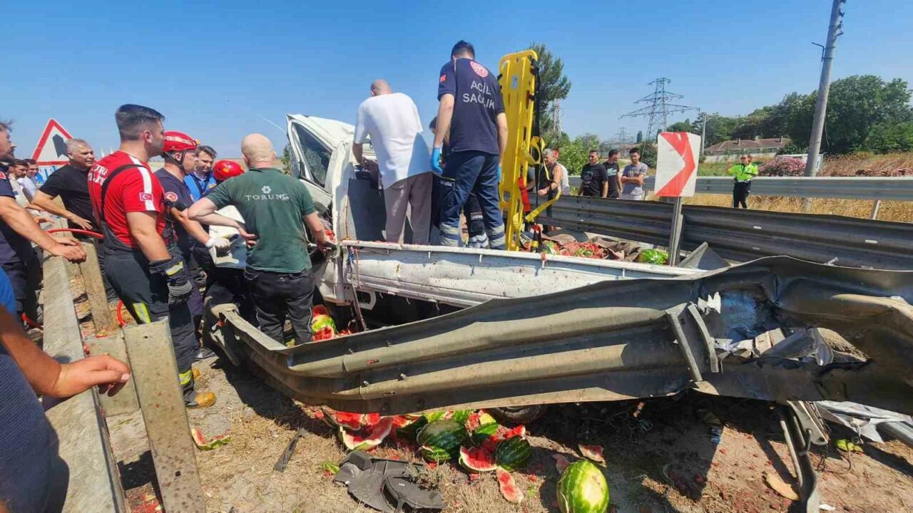 Balıkesir-Bursa otobanında karpuz yüklü kamyonet refüje çarptı. Yola dökülen karpuzlar tehlike saçarken, sürücü ön kısmı parçalanan kamyonet içerisinde sıkıştı.