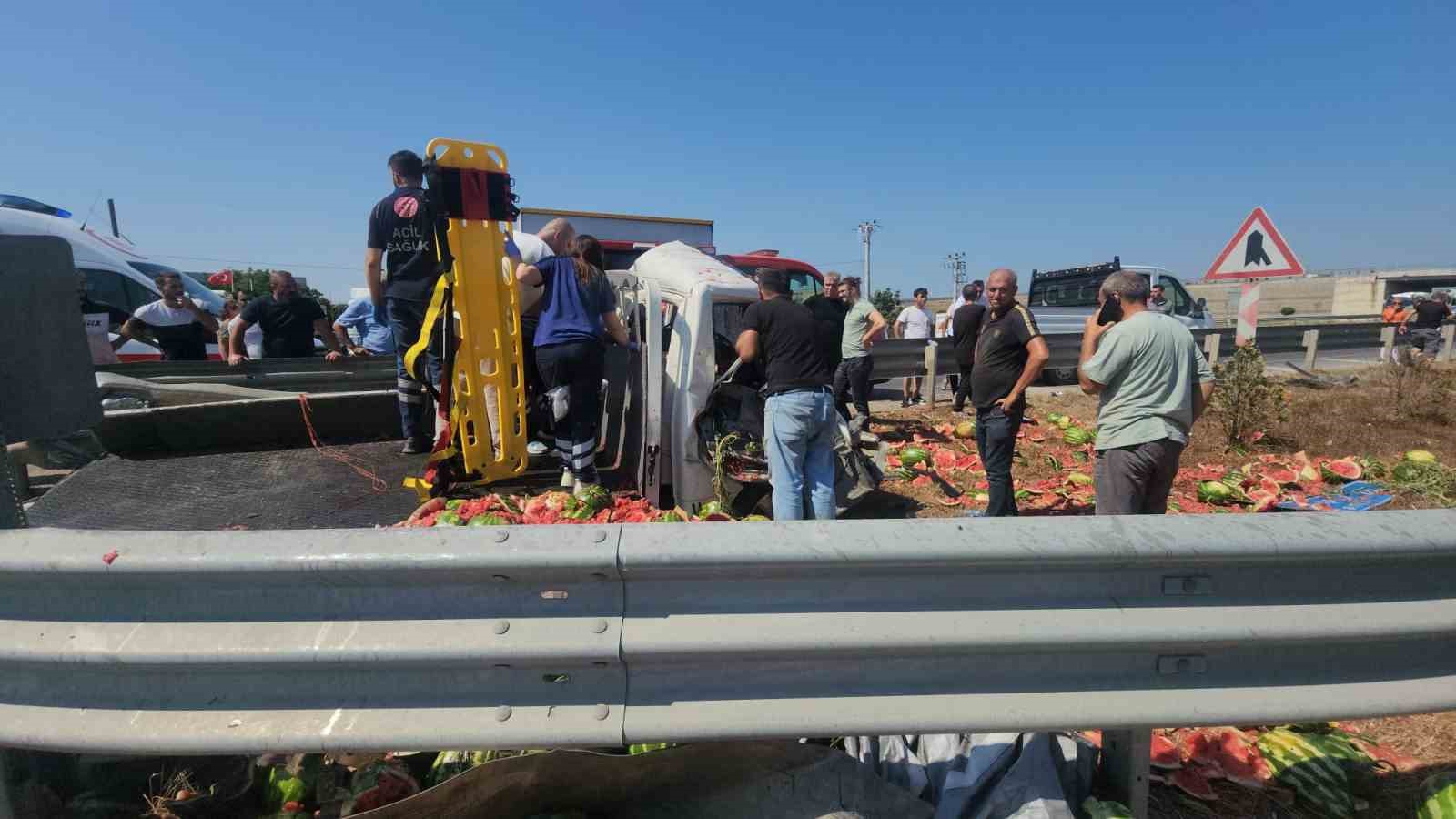 Demir bariyerleri kırarak aşan aracın ön kısmı parçalanırken, sürücü kamyonet içerisinde sıkıştı. İhbar üzerine olay yerine polis, sağlık ve itfaiye ekipleri sevk edildi. Araçta sıkışan sürücü, itfaiye ekiplerinin yardımı ile çıkarıldı. Ortalığı savaş alanına çeviren kazada yola saçılan karpuzlar görevliler tarafından temizlenirken, sürücünün kamyonetten çıkarıldığı anlar kameraya yansıdı.