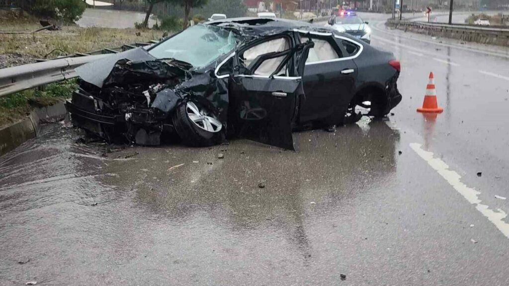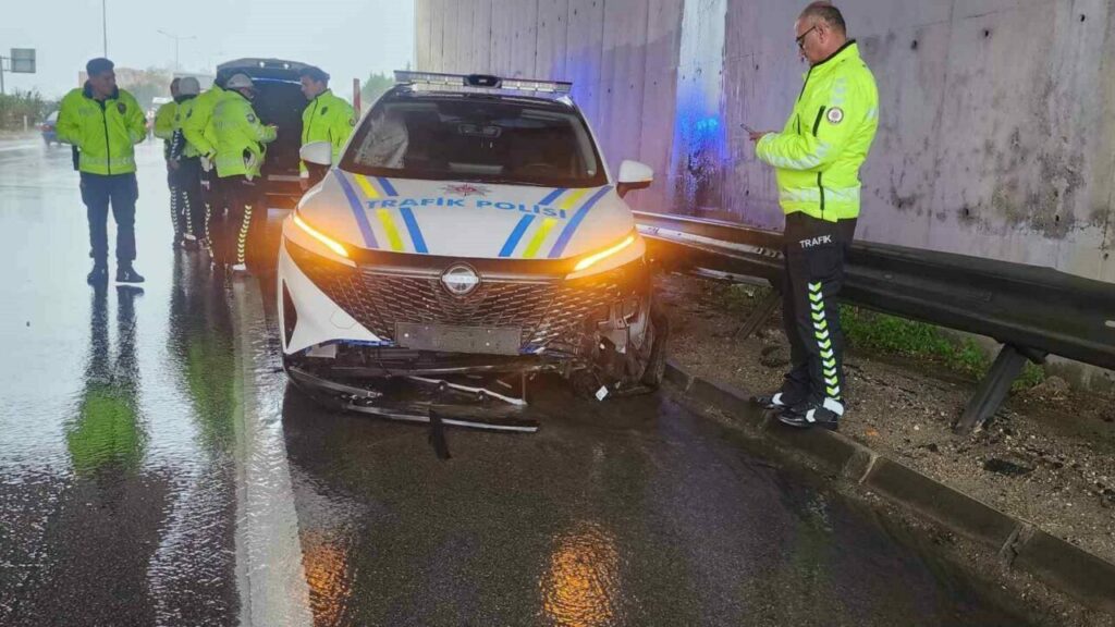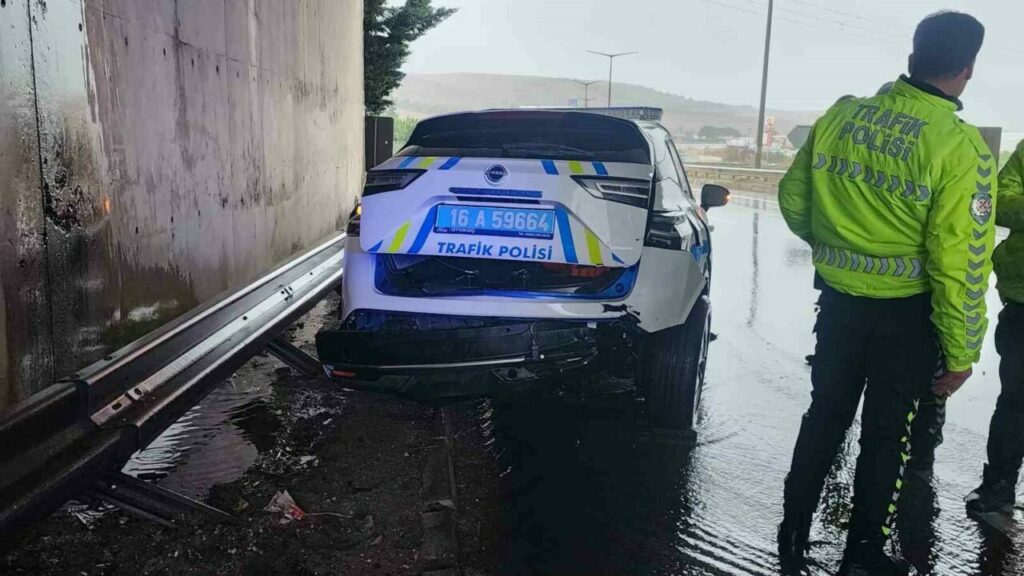 Bursa’nın Mustafakemalpaşa ilçesinde yoğun yağış nedeniyle su toplayan yolda bariyerlere çarpan otomobile olay yerinden geçen bölge trafik ekiplerinin çarpması sonucu iki kaza meydana geldi. Kaza anı kameraya yansırken, yeni alınan emniyet cipi kullanılamaz hale geldi.