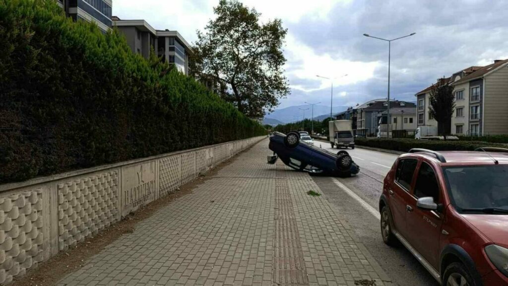 Bursa’nın İnegöl ilçesinde meydana gelen kaza da takla atarak ters duran otomobilin sürücüsü 1 kişi yaralandı. Kaza anı bir sitenin güvenlik kamerasına saniye saniye yansıdı.