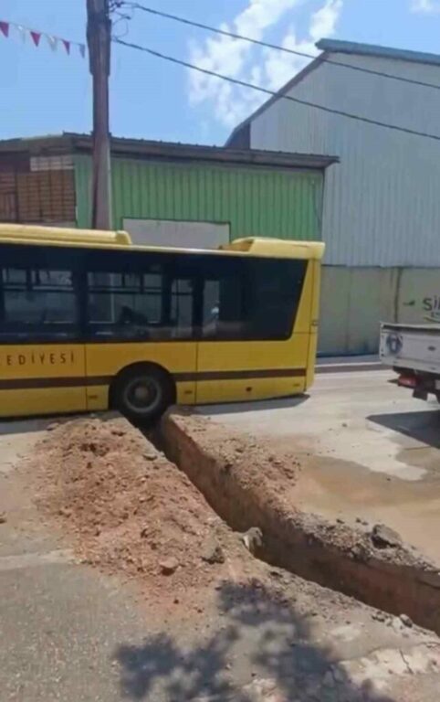 Bursa’nın Nilüfer ilçesi Vakıfköy Mahallesi’nde ilerleyen halk otobüsünün şoförü, alt yapı çalışması için kazı yapılan yerden geçmek istedi. Aracın ön kısmı çukuru atlatırken, arka teker havada asılı kaldı. Aracı bir türlü olduğu yerden çıkaramayan otobüs şoförü yolcuları tahliye ederken, yetkililerden yardım istedi. Bölgeye polis ve belediye ekibi sevk edildi. Araç iş makinası yardımı ile çıkarılırken, talihsiz kazada yaralanan olmadı.