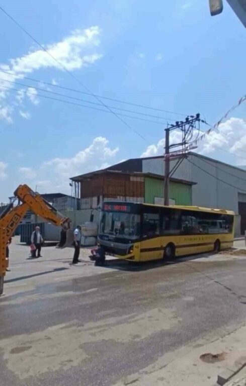 Bursa’da kazı çalışması yapılan yerden geçmek isteyen halk otobüsünün tekeri çukurda kalınca çıkamadı. Araçtaki yolcular tahliye edilirken, otobüs iş makinası yardımı ile mahsur kaldığı yerden çekildi.