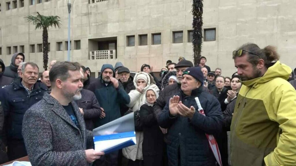 Bursa’da bir müteahhit, 428 kişinin hak sahibi olduğu daireleri kentsel dönüşüm projesi çerçevesinde 2 yılda teslim etmesi gerekirken, aradan 8 yıl geçmesine rağmen teslim etmedi. Mahkeme kararıyla sözleşmesi fesih edilen müteahhit, iddiaya göre daireleri sahte sözleşmelerle başka kişilere sattığı için, asıl daire sahiplerini evlerini satmaya zorluyor. Adliye önünde toplanan mağdurlar hakları olan dairelerini istediler.