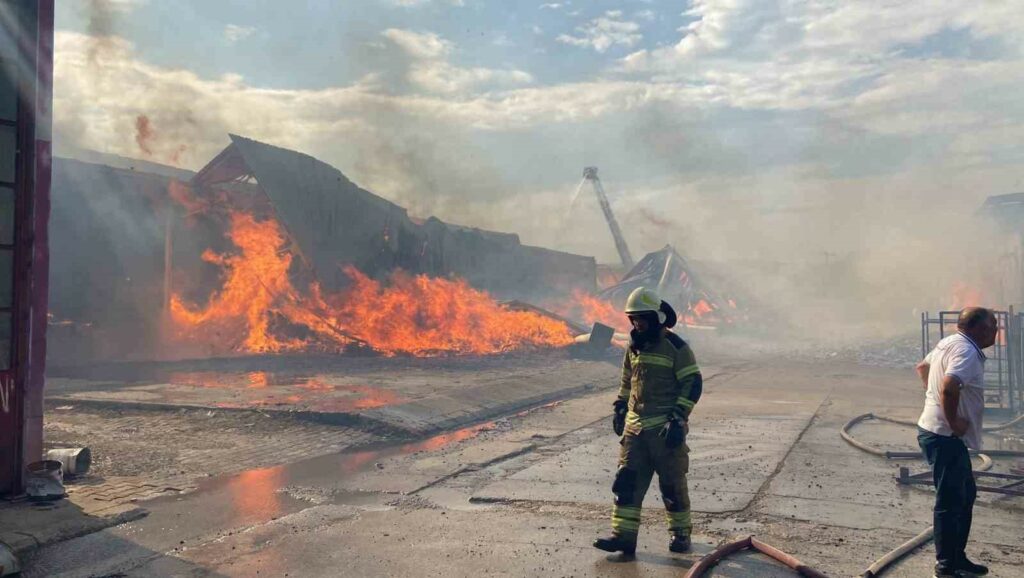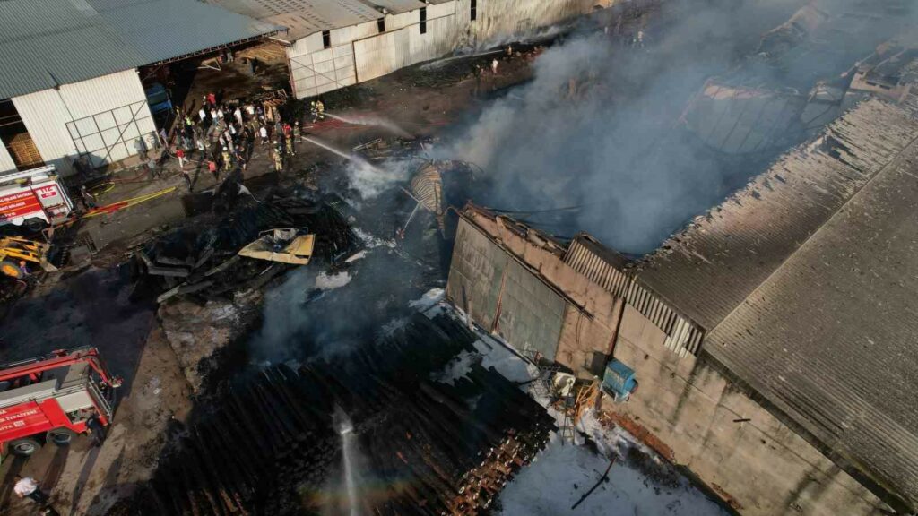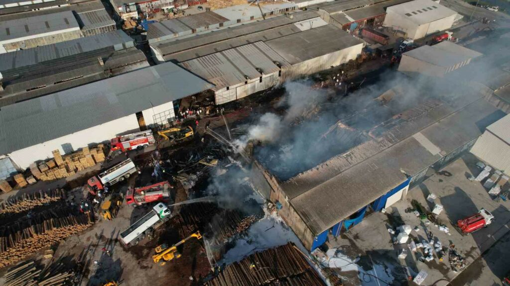 Bursa’nın Yenişehir ilçesinde kereste fabrikasında çıkan yangın rüzgarın da etkisiyle büyüyerek iş yerlerine sıçradı. Yangın ekiplerin erken müdahalesi sonrası kontrol altına alınırken, bölge havadan görüntülendi.