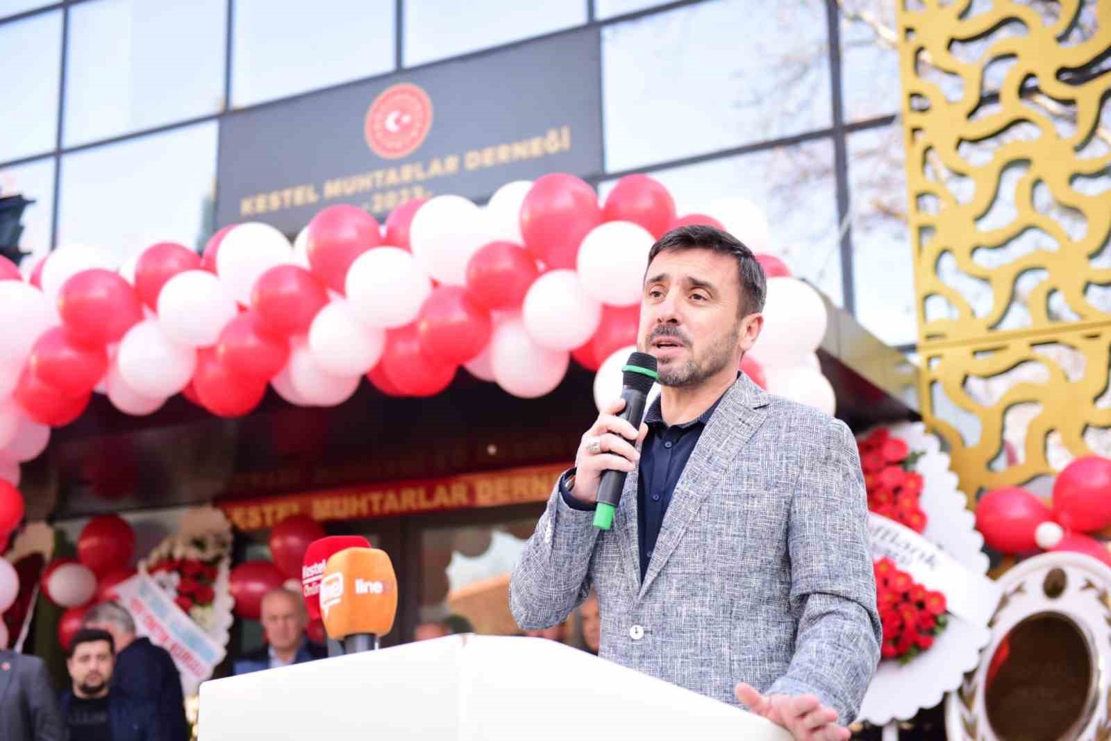 Derneğin açılışında konuşan Kestel Kaymakamı Recep Öztürk, ” Vatandaşımızın devlete en sıcak ulaşan eli, en yakın idare birimi olan muhtarlarımız bölgelerimizdeki, geliştirdiğimiz projelerin köylerimize, mahallelerimize ulaşmasında bizlerle her zaman işbirliği içinde olmuşlardır. Bizlere her zaman yardımcı olmuşlardır. Muhtarlık gerçekten fedakarlık özveri isteyen bir mühessesedir. Bu açıdan hepsini ayrı ayrı tebrik ediyorum. Bu binamızın ilçemize kazandırılmasında en büyük emeği olan başta Belediye Başkanımıza teşekkür ediyoru. Bu binamızın ilçemize hayırlı olmasını diliyorum” dedi.