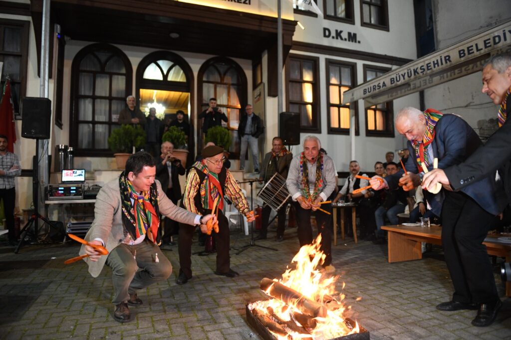 Osman Gazi’yi Anma ve Bursa’nın Fetih Günü Etkinlikleri kapsamında düzenlenen geleneksel köy düğünü etkinliğinin en önemli bölümlerinden biri olan kınası gecesi ile Türk kültüründeki bin yıllık kına eğlencesi geleneği günümüze taşındı. DAĞ-DER Kültür Merkezi’nde gerçekleşen kına gecesi etkinliği, birbirinden renkli görüntülere sahne oldu. Kına eğlencesi öncesi gençler, Osmangazi Belediye Başkanı Erkan Aydın’ı davul ve zurnayla karşıladı. Büyük bir coşkuyla yapılan karşılama merasiminin ardından Başkan Aydın, yol boyunca oynanan yörük oyunları eşliğinde DAĞ-DER Kültür Merkezi’ne getirildi. DAĞ-DER yönetimi ile çok sayıda vatandaşın katıldığı kına eğlencesi, halk oyunları ekiplerinin ateş etrafındaki oyunları ile başladı. Kına gecesinde Başkan Aydın da oyunlara eşlik etti.