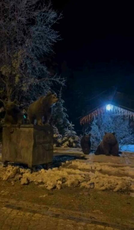 Bursa Uludağ’da yerleşim alanlarına inen ayılar, çöp konteynerlerinin üzerinde dolaştı. Çöp konteynerini karıştıran 1 anne ve 3 yavru ayının, bölgede kar yağmasına rağmen hala kış uykusuna yatmamaları dikkat çekti.