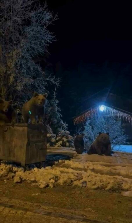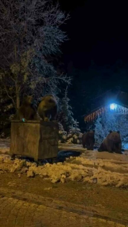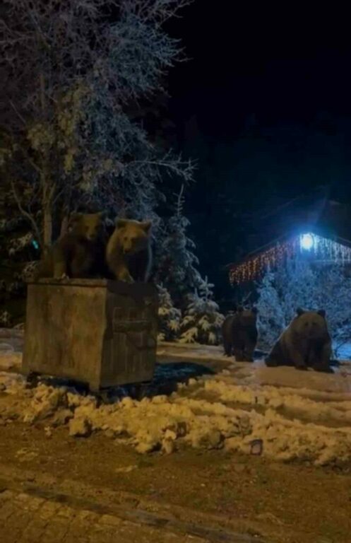 Bursa Uludağ’da yerleşim alanlarına inen ayılar, çöp konteynerlerinin üzerinde dolaştı. Çöp konteynerini karıştıran 1 anne ve 3 yavru ayının, bölgede kar yağmasına rağmen hala kış uykusuna yatmamaları dikkat çekti.