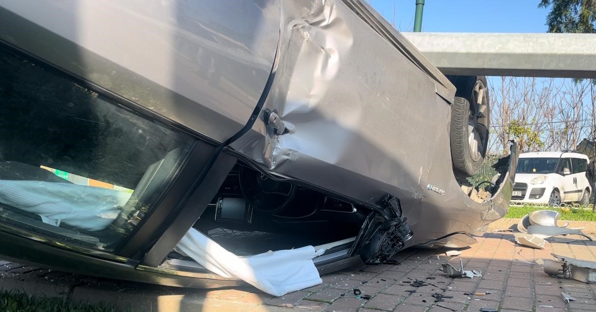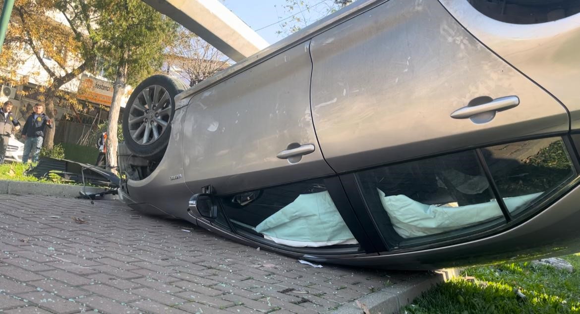 Bursa’da kontrolden çıkan otomobil aydınlatma direğine çarpıp takla attı. Kaldırımda ters dönen otomobilin üzerine direk devrilirken, araçtaki 4 kişi burnu bile kanamadan dışarı çıktı.